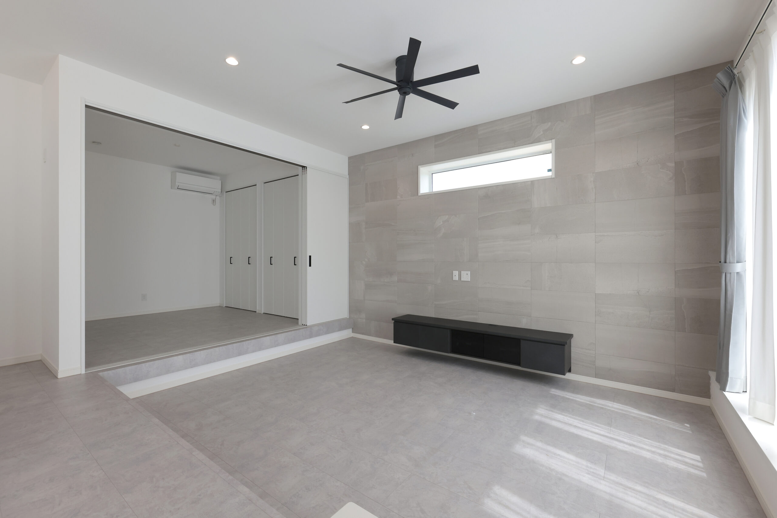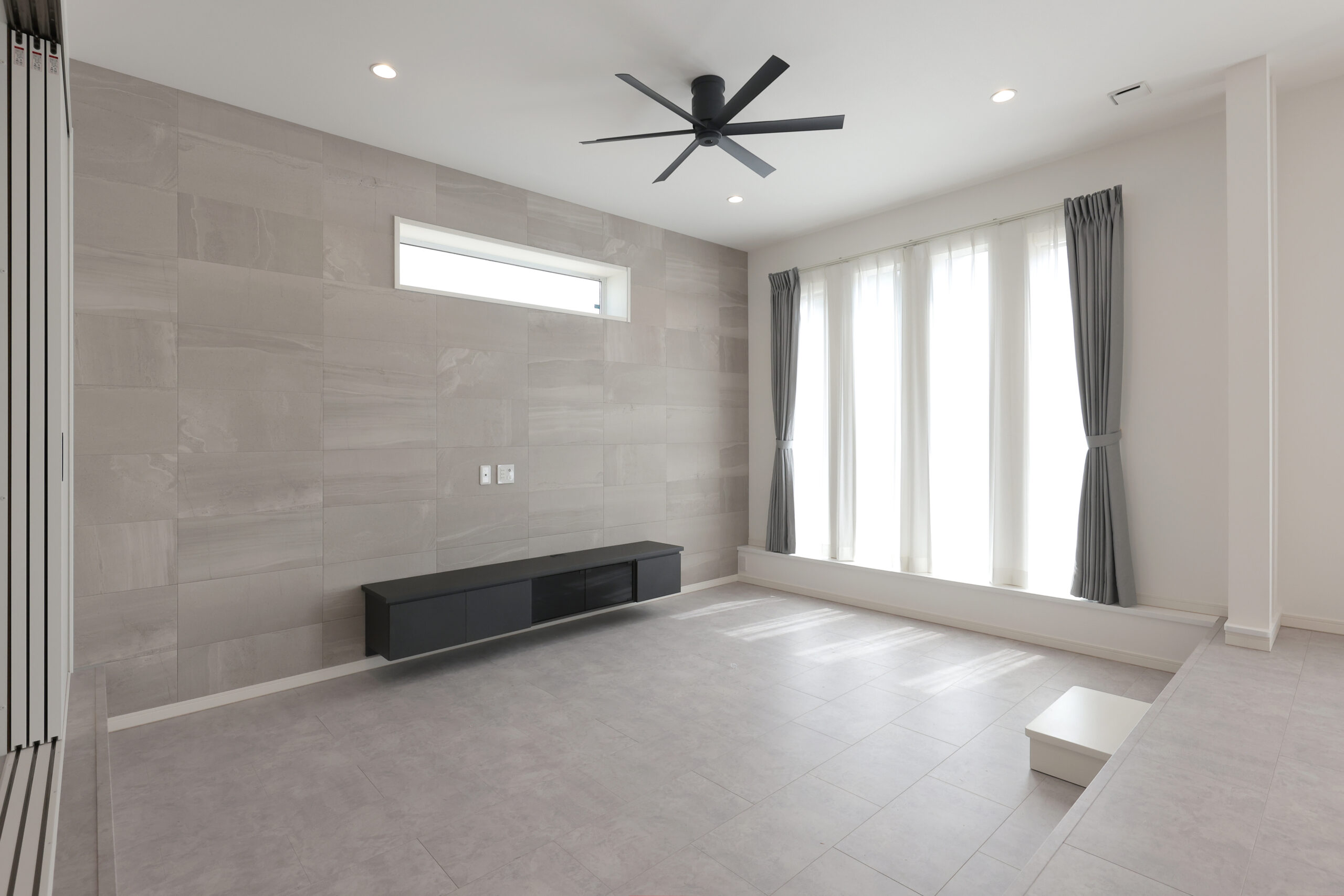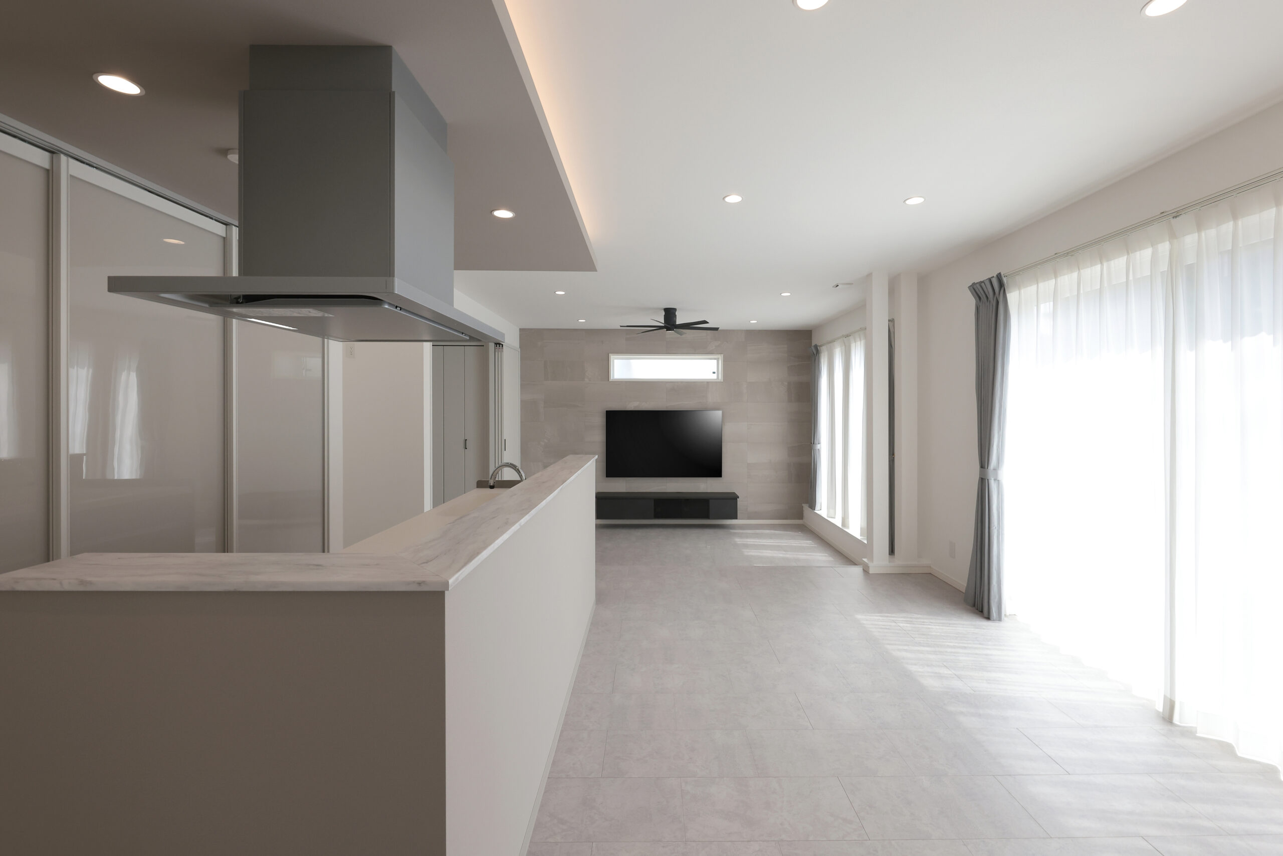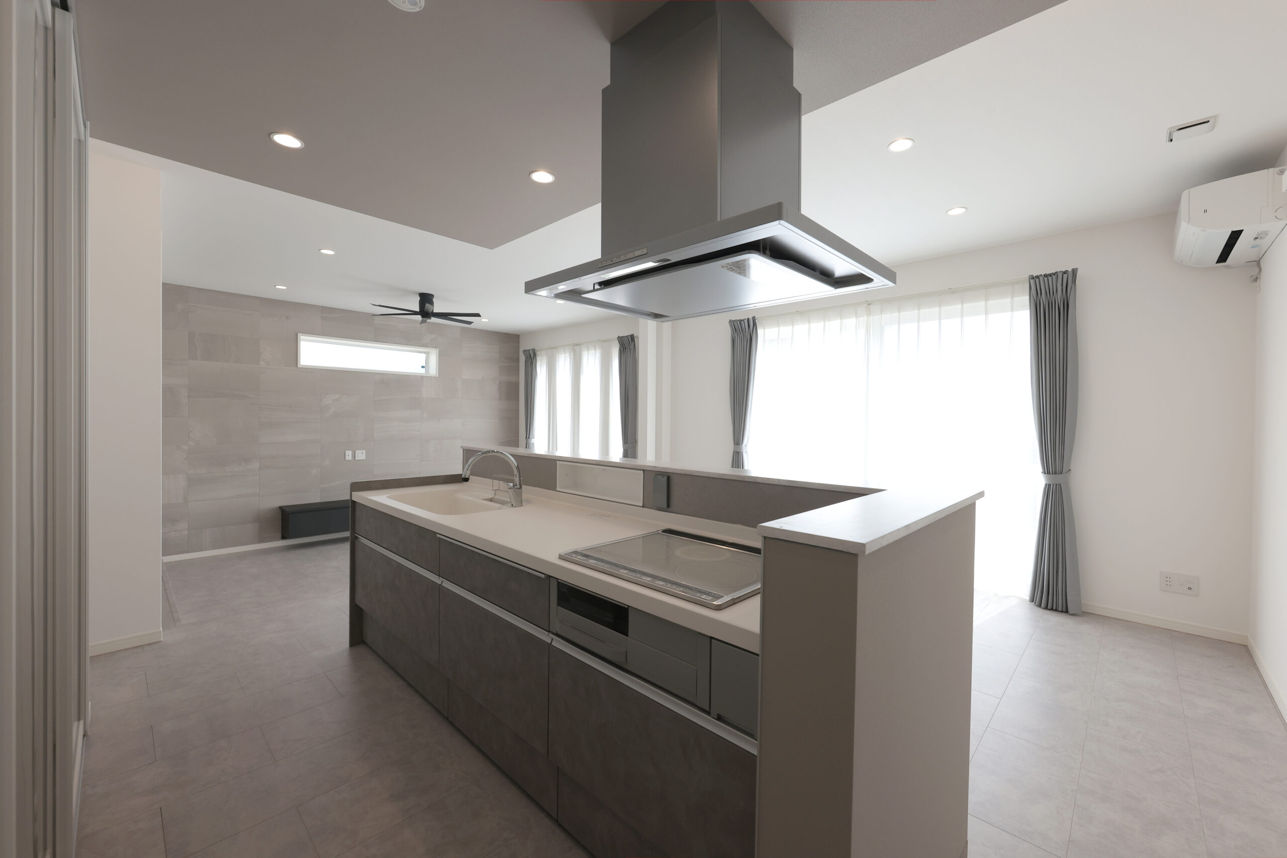 流行のグレーを基調としたおしゃれな黒い総タイルの平屋。シンプルでモダンなデザインが特徴で、シーリングファンが涼やかな空気を提供します。オープンキッチンが家族の交流を促進し、大容量のパントリーとシューズクロークで収納力も抜群。スタイリッシュで機能的な空間が、快適でスムーズな暮らしをサポートします。