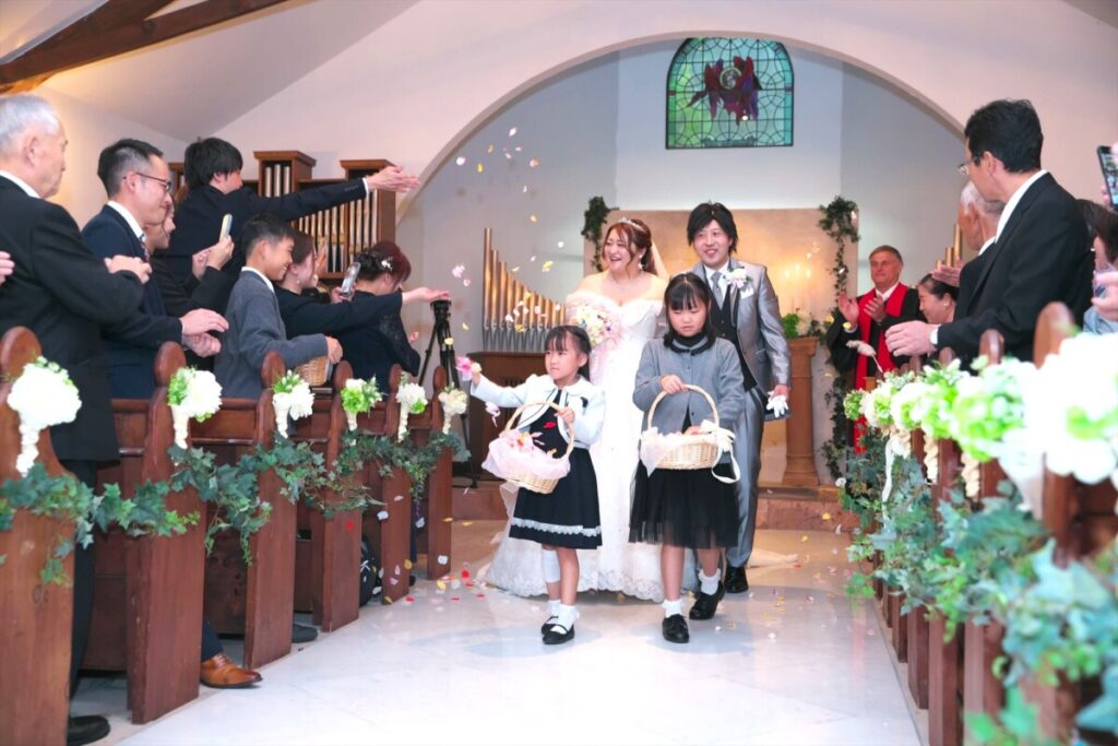 バージンロードは父の代わりに兄2人にお願いし3人で歩きました。リングカーに乗って娘(7ヶ月)と甥(1才9ヶ月)にリングを届けてもらいました。外はあいにくの雨だったのでフラワーガールは中になってしまいましたが姪2人にお願いし一緒に退場しました。大好きな兄とバージンロードを歩けて嬉しかったです。リングカーの2人の姿がめちゃくちゃ可愛くてみんなをもっと笑顔にしてくれていい思い出です。雨でとても残念で申し訳ない気持ちでいっぱいでしたが教会の中でもみんなと写真を撮ったり話をしたりしてみんなの笑顔がみれて安心しました。
